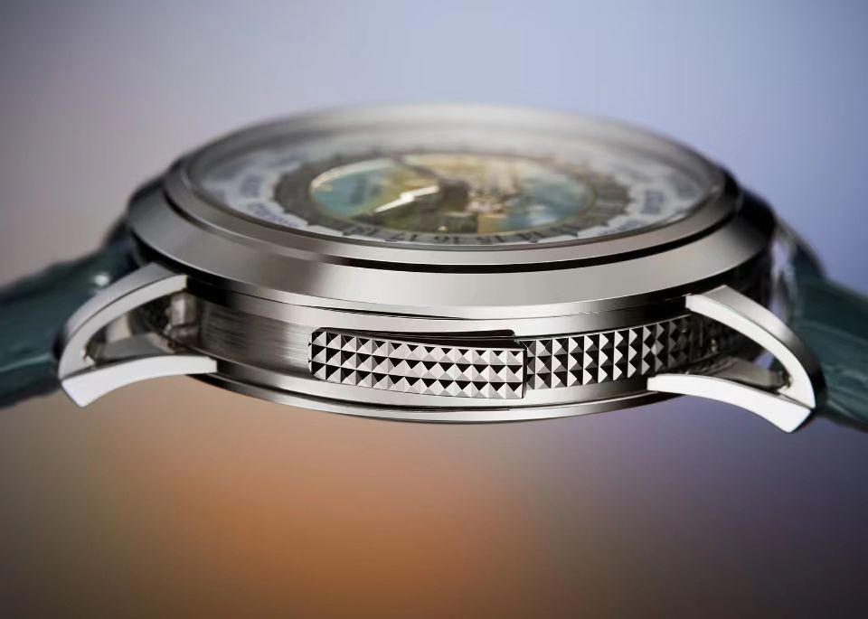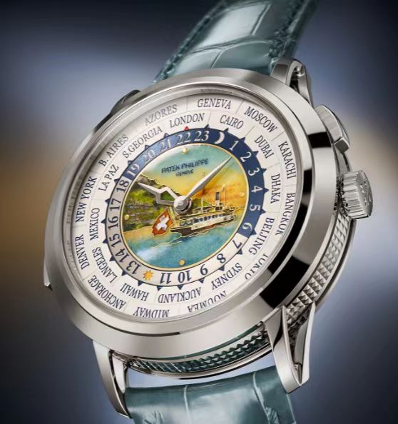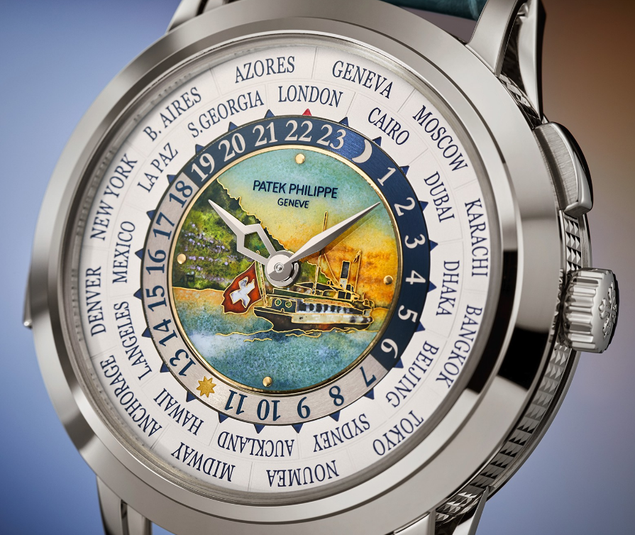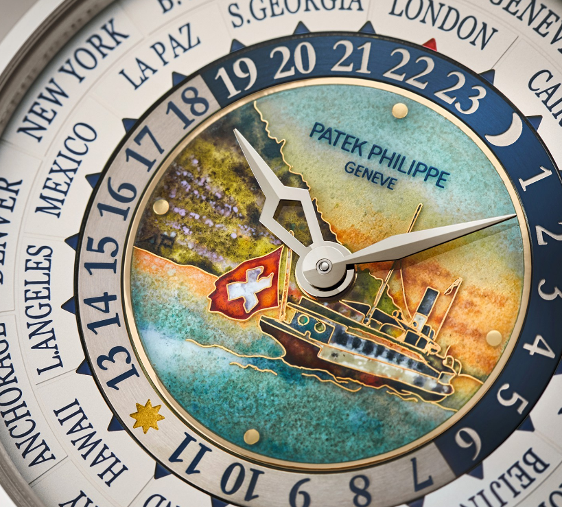 表盘材质:中央采用大明火掐丝珐琅工艺,描绘蒸汽船巡游于日内瓦湖的旖旎风光。 18K金表盘,设有24小时刻度环。