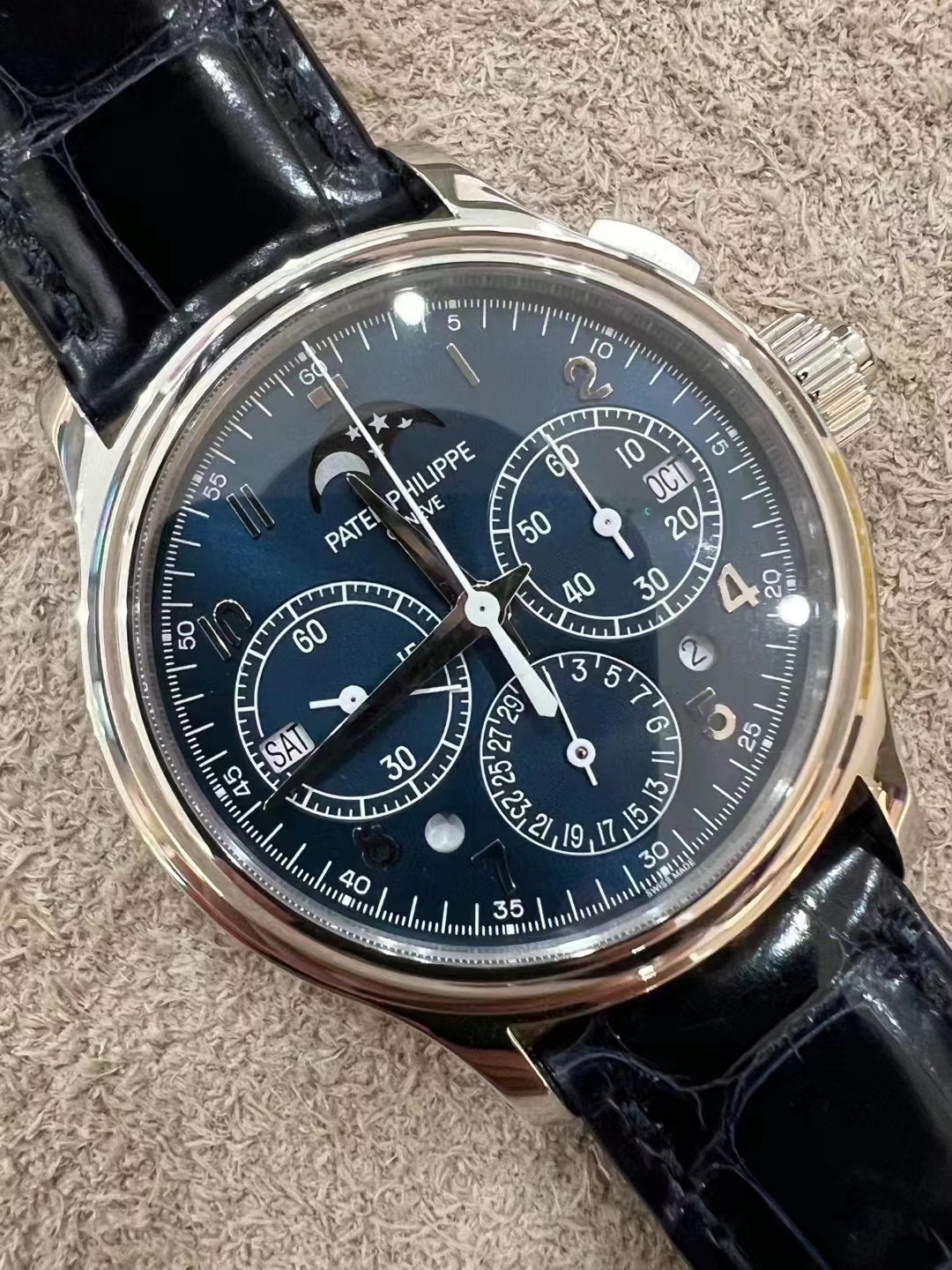 百达翡丽超级复杂功能时计系列5372P-001腕表 品牌:百达翡丽 系列:超级复杂功能时计 款式:手动机械,38.3毫米,男士 材质:950铂金 功能:日期显示、星期显示、月份显示、年历显示、万年历、月相、计时、追针 表壳厚度:12.93毫米 表盘颜色:蓝色 表盘形状:圆形 表带颜色:海军蓝色 表扣类型:折叠扣 表底:背透,可互换底盖和蓝宝石水晶透盖 防水深度:30米 详情请咨询官方电话: 15679987654 (长按复制) 详情请咨询官方微信: 15679987654 (长按复制) |