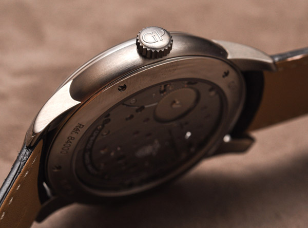 腕表内部搭载蕴藏惊人设计美学的腕表采用镶嵌微转子的全新 GP08400 自动上链机芯( 14 ¼ 法分),正如镂空表盘所展示的,这枚引人入胜的机芯具备完美的对称感—微型自动盘与发条鼓精密地镶嵌于同一轴线之上,带来高达 50 小时的动力储备。