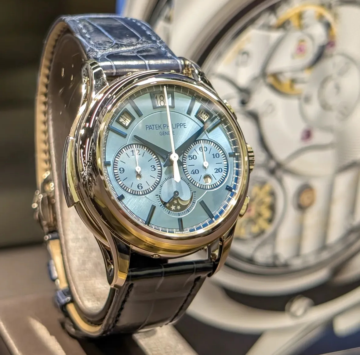 简介:新款四重复杂功能腕表 Ref. 5308G-001 配备优雅的冰蓝色日辉纹表盘,与蓝色金属喷镀处理的白金琢面立体时标和琢面剑形指针相得益彰。