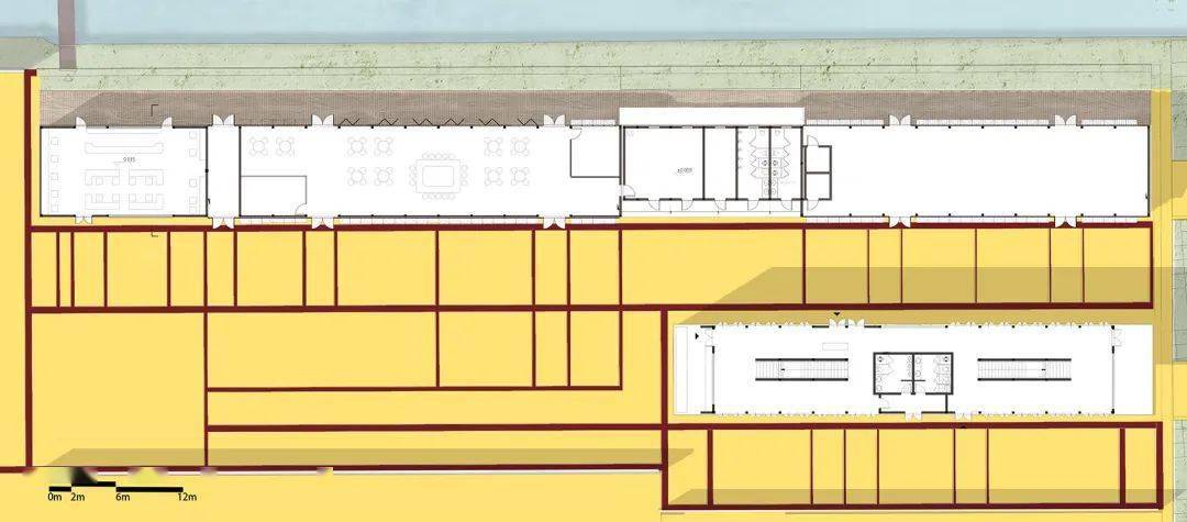 ▲轴测图Wutopia Lab 原本的农具仓库,以素混凝土立面更新,成为晒谷场的辅助用房。剩余部分谷仓以及原二层宿舍楼,保留原有建筑形式,立面更换为乳白色聚碳酸酯板,成为光明牛奶屋,作为光明集团新农业产品研发、展示的多功能空间。 在场地的末尾,原本的厕所设计成为未来胶囊(活动装置),暗红色的地面线条到了这个终点,化身成为一个可以开合由耐候钢板构成的四棱锥,内部将储存大量的记忆胶囊,内容是给未来亲人、朋友、甚至是自己的一段话或是一段数据。不同材料的建筑,如同不同的记忆,散布在这黄色的晒谷场,每进入一间,仿佛都可以触发一段不同时代的等你探索的故事。