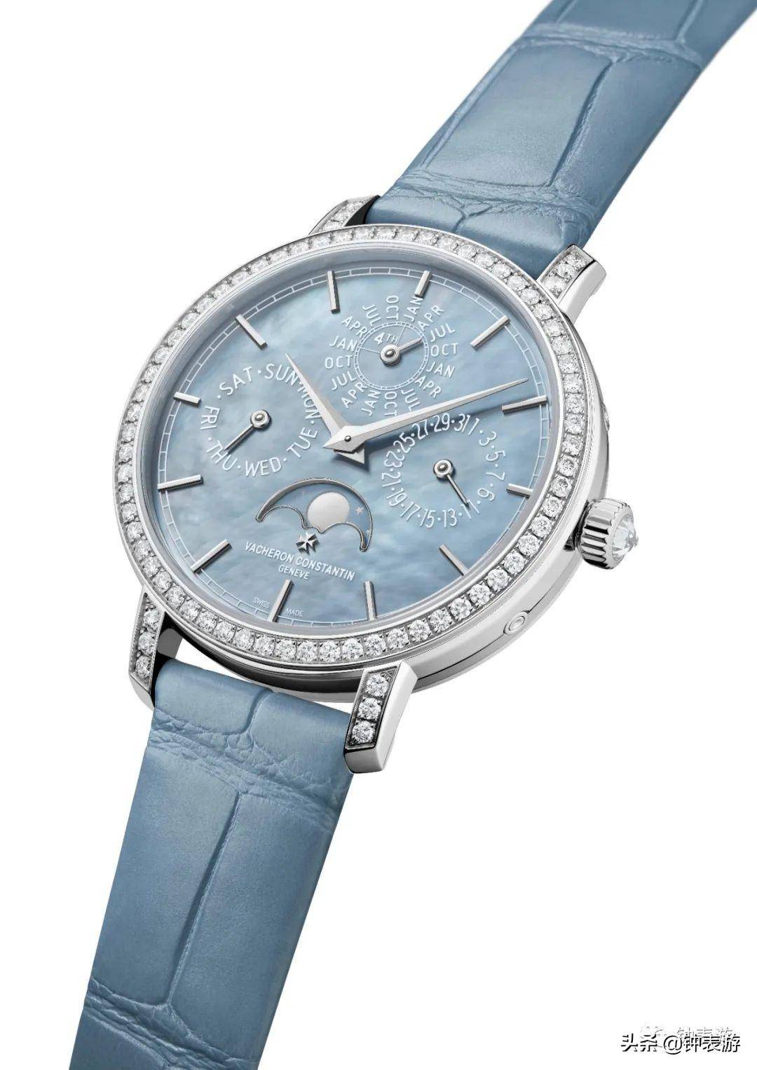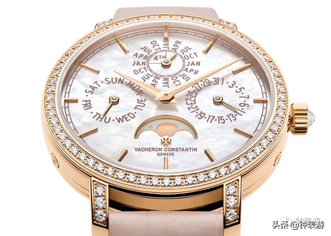 4 36.5毫米表径、专为气质女生推出的Traditionnelle传袭系列超薄万年历腕表。因为是专为女生设计的万年历表款,所以有女生最爱的钻石镶嵌,珍珠贝母表盘色彩也青雅高贵,表带的搭配同样浑然一体。