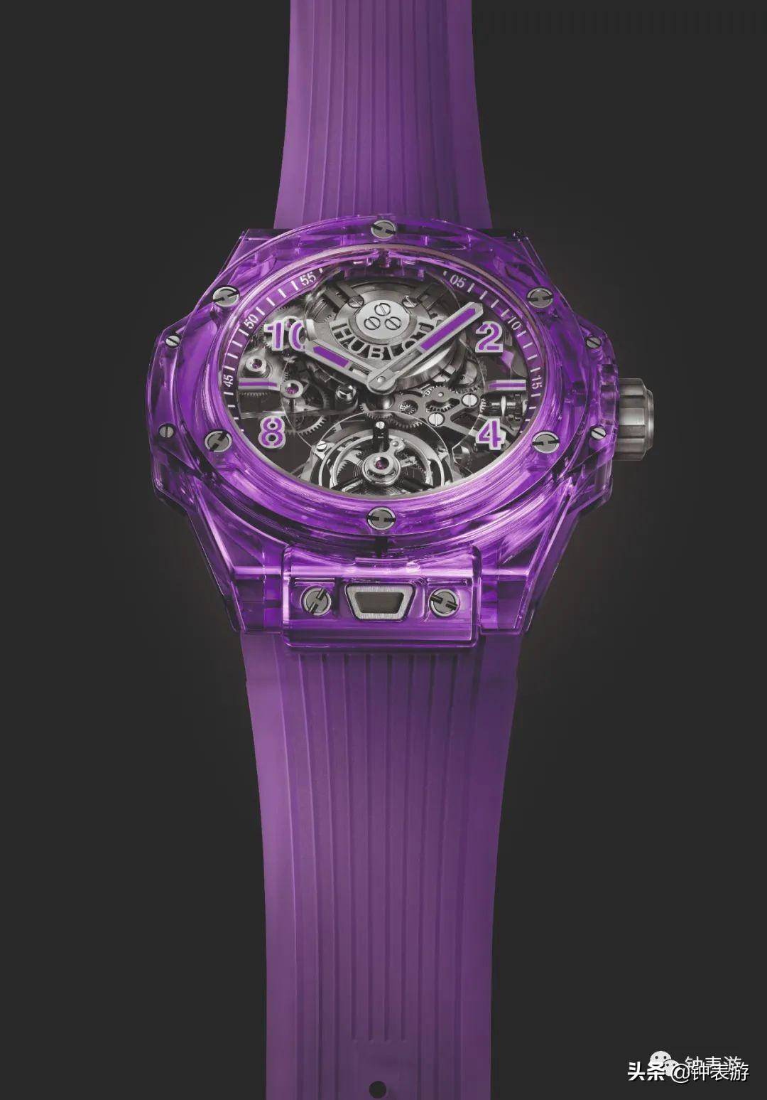 通过这款表,宇舶正式发布了一种全球首创且品牌专属合成蓝宝石材质,为高级制表领域增添了一种全新配色:通透的紫色。